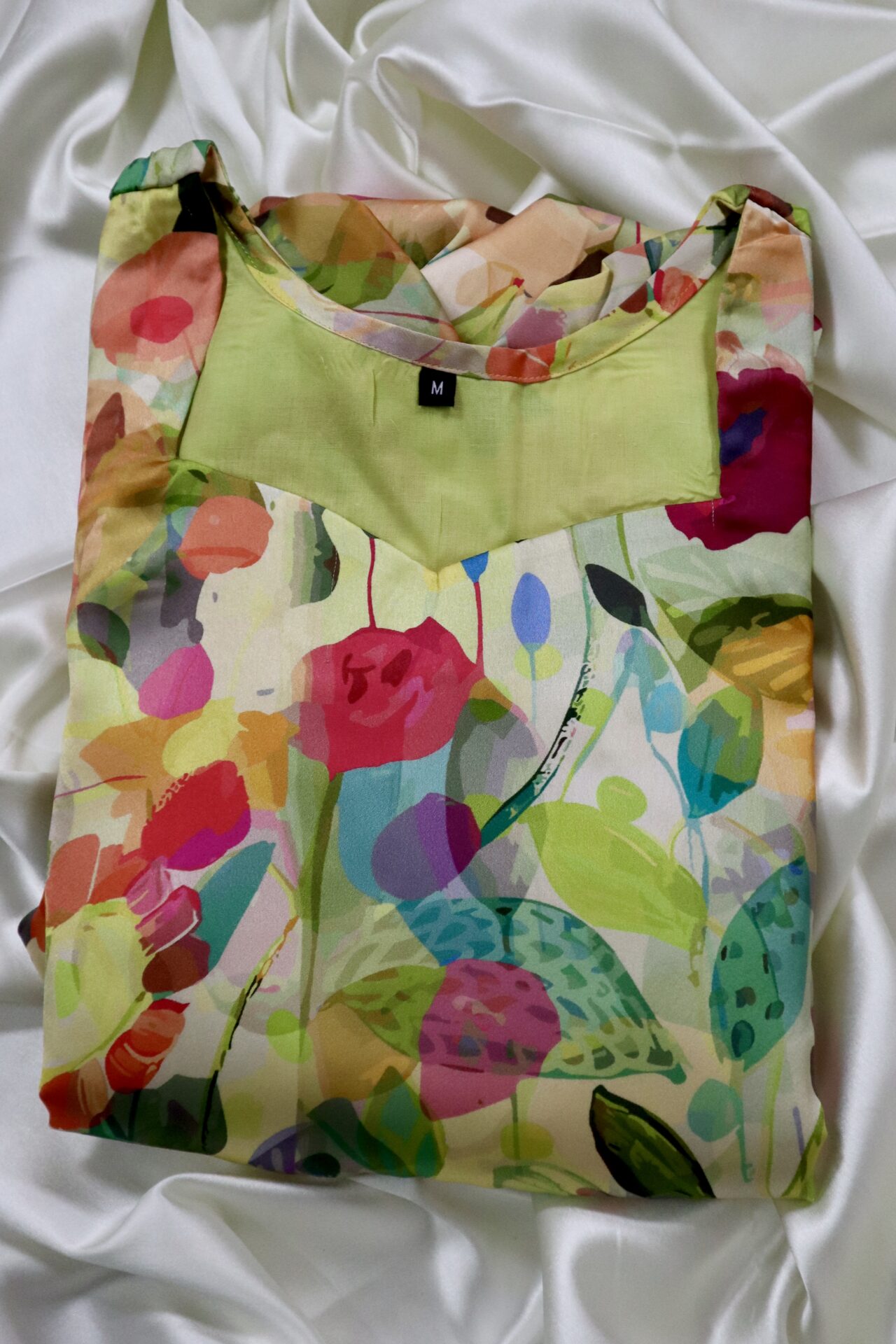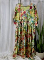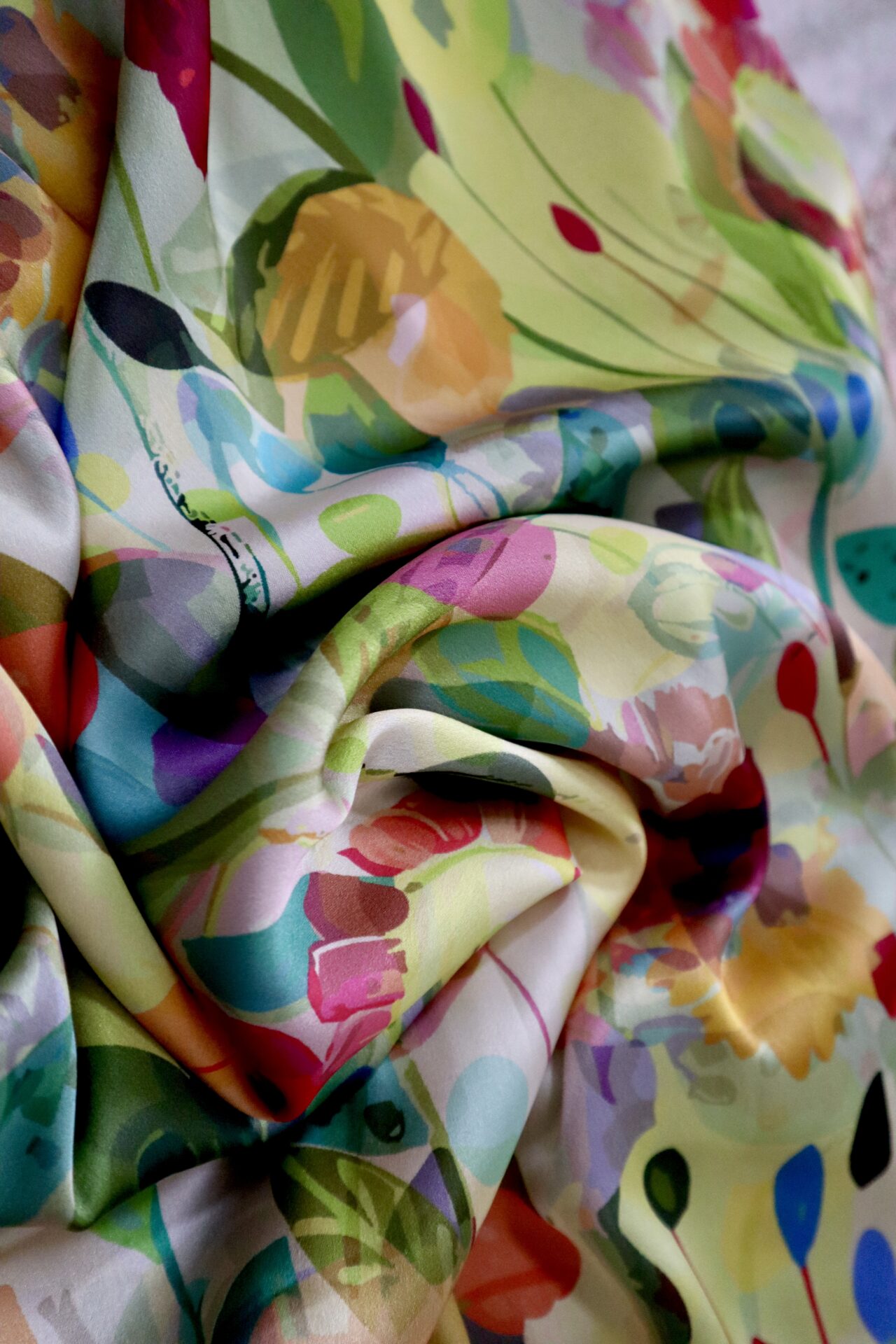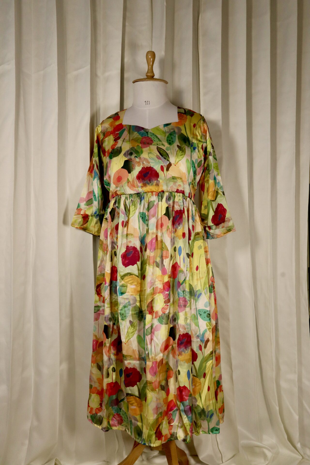 Flowing maxi dress inspired by the colors of a blooming garden after spring rain. Crafted from soft, airy fabric that dances with every movement, this piece blends artistry and elegance through its hand-illustrated floral pattern
